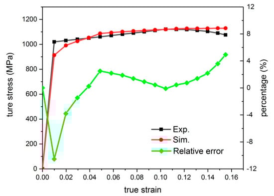 Comparison of true stress–strain curves and the relative error of experiment and the CPFEM simulation.