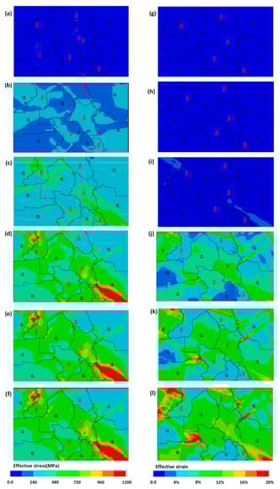 Stress and strain fields at macro strain = 0.1%, 0.7%, 1.2%, 4%, 7.8%, and 15.5%: (a–f) Von Mises effective stress field; (g–l) effective strain field.