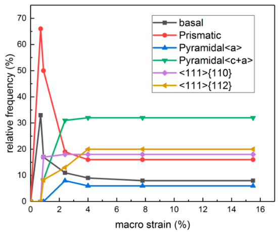 In order to further study the grain interactions of different phases during the plastic deformation, it was necessary to analyze the evolution of slip systems. In this simulation, a total of 155 load steps (macro strain = 15.5%) were carried out to analyze the data of the slip systems, as shown in Figure 8, where the relative frequency meant the ratio of the number of the activated slip systems to the total number activated. In this figure, the relative frequencies showed a tendency of saturation after the macro strain of 2.4%, but their absolute quantity increased, which was similar to the experimental results reported by Liu et al. [34]. On the basis of the data of the α phase, it is found that the deformation was mainly determined by basal and prismatic slip systems, which was because of the low critical resolved shear stress. With the development of deformation, the pyramidal slip systems activated and the number of pyramidal <c + a> slip systems significantly increased. According to the statistics, after reaching the macro strains of 2.4%, 4%, 7.8%, and 15.5%, the relative frequencies of pyramidal <c + a> slip systems were 31%, 32%, 32%, and 32%, respectively, which was the highest proportion of the corresponding deformation of the α phase.