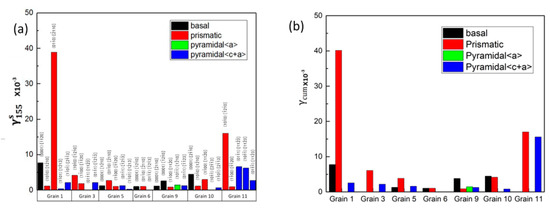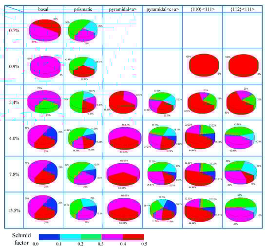 Therefore, the recalculated SFs were shown in Figure 13. By comparing Figure 11 and Figure 13, it was found that SFs overall were higher in Figure 13 than that in Figure 11, especially for the values of prismatic slip systems and pyramidal<a> slip systems.