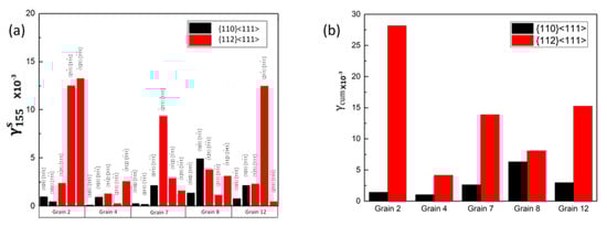 When the macro strain was 15.5%, the and of the β phase are shown in Figure 10. As we can see, some individual{112} <111> slip systems, such as and in grain No. 2, the values were 12.523 × 10−3 and 13.271 × 10−3, respectively, which were significantly higher than others in the same grain. According to the diagram, it was found that all values of the {112} <111> slip systems were higher than the of {110} <111>, which meant the contribution of {112} <111> to the plastic deformation was much larger than {110} <111>. Therefore, we can draw the conclusion that the {110} <111> slip systems were easily activated because of the lower critical resolved shear stress, while the contribution of them to the plastic deformation is lower than {112} <111>. On the basis that some of the {112} <111> slip systems are much higher than of {110} <111> slip systems, it was considered that the orientation of some of {112} <111> slip systems was conducive to the plastic deformation, as also reported in the literature [14].