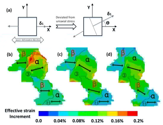 (a) Schematic diagram of major principal stress; (b) ε = 0.7%; (c) ε = 2.4%; (d) ε = 7.8% effective strain increment fields in the local and the direction of major principal stress.