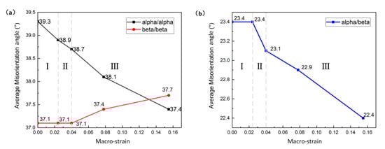 In order to study the grain interactions during deformation, the average grain misorientation angles were statistically analyzed (the calculation method is described in Section 2.2.3. As shown in Figure 14a,b, the curves were divided into three stages: macro strain less than 2.4% is stage I; macro strain between 2.4% and 4% is stage II; macro strain more than 4% is stage III. In stage I, the average misorientation angles of the α/α phase decreased, while those of the β/β and α/β phases remain invariant. In stage II, the average misorientation angles of the α/α and α/β phases decreased, while those of the β/β phase remain invariant. In stage III, the average misorientation angles of the α/α and α/β phases decreased, while those of the β/β phase began to increase. Therefore, we can draw the conclusion that the α phase produced plastic deformation first in stage I. When the deformation reached a certain degree (entering stage II), the grains of the α phase forced the neighboring grains of the β phase to deform and rotate. After that, when the deformation caused by “the driving effect” reached a certain degree (entering stage III), the average misorientation angles of the β/β phase began to increase to adapt to the overall deformation.