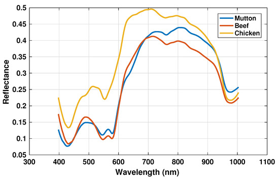Mean reflectance spectrum for beef, mutton and chicken minced meat.