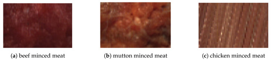 The HSI system formulates high spatial information throughout the entire visible to near-infrared (VNIR) region. Each image in the captured spectrum contains information about the minced meat with the background of the translational tray. Therefore, to limit the computational complexity, the region of interest (ROI) needs to be extracted by computing a true-color image by mean of the correlation coefficient method [31]. The extracted ROI goes to the process of the blob analysis technique to formulate a static size of [24], which are represented in Figure 3. Each image in its true color form represents its texture, such as Figure 3a represents beef minced meat texture and Figure 3c represents chicken minced meat texture.
