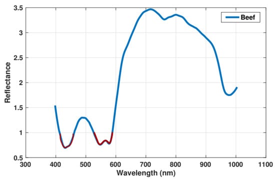 where is the pre-processed spectrum, represents the accurate reflectance with as entire wavelength range and represents the wavelength of 525 nm [24]. Since Mb pigment (color) is the primary source for the identification and classification of each minced meat type, and to reduce the spectral dimension, the pre-processed spectrum under the interval of 0 to 1 is considered as most useful as shown in Equation (3).