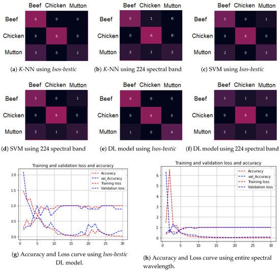 To compare with deep models, two traditional classifier SVM and KNN were used one after the other. A train set of 42 samples cube’s (training set) containing 1848 images was passed to the classifiers with 132,000 features in each cube. For SVM, the kernel function (RBF) was used, with a classification type of one vs. all approaches. However, for KNN, a total number of 8 neighbors with a leaf size of 30 were used respectively. The confusion matrix for SVM and KNN classifier can be seen in Figure 7a,b, which represents the number of samples successfully classified on blind test set ( 132,000) for both traditional classifiers and achieved the classification accuracy of respectively. In addition to that, the entire reflectance is also analyzed and compared with the proposed band reduction method, as shown in Figure 7b for K-NN and Figure 7d for SVM classifier. The proposed method outperformed the entire spectral classification method by achieving the overall accuracy of .