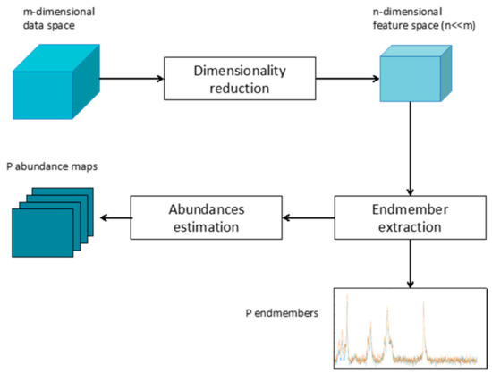 Whether linear or nonlinear, the general framework of spectral unmixing can be summarized in dimensionality reduction, endmember identification, and abundance estimation, as depicted in Figure 1.