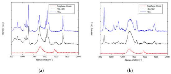 Figure 3 shows the Raman spectra of GO powder, neat PCL, PCL-GO, PLA, and PLA-GO 3D samples. GO spectrum is characterized by the two typical peaks at about 1320 cm−1 (D band) and 1580 cm−1 (G band), which is clearly identifiable in both spectra acquired from the printed composites.