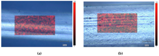 Similarly, to the previous experiment, we applied a SAD-based technique to detect and identify all the different materials present in the sample. The identification is carried out by deriving a similarity index obtained by comparing each pixel of the Raman map with a set of reference spectra based on the SAD value. Figure 9 reports the comparison between the most similar spectra and the reference spectra for PLA and GO, respectively. In this case, while it is possible to correctly identify the PLA, which is the dominant material, this approach does not allow the detection of GO, which is only present in a mixed solution.