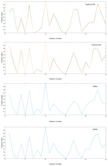 The obtained results have been compared with those collected using the classical linear unmixing approach, without the projection in the feature space. Analyzing Figure 4, showing the reference spectra and the endmembers resulting from the linear approach, it is possible to note that while the first endmember, noted as EM#1, is very similar to the PCL reference spectra, the second endmember, noted as EM#2, presents spectral characteristics more similar to a mixed spectrum rather than pure GO. This can be clear comparing the response of features 18, 21, and 25 reported in Figure 5.