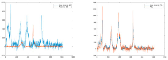 Comparisons between reference spectra (GO on the left, PCL on the right), and the spectra most similar in terms of SAD.