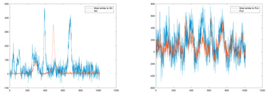 Comparisons between reference spectra (GO on the left, PLA on the right), and the spectra most similar in terms of SAD.