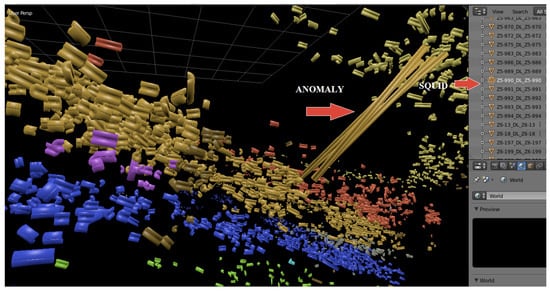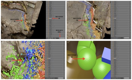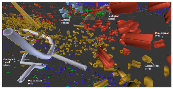 - Creation of tridimensional distribution maps about a particular group of artefacts. Similarly, it might be useful to include information about significant features concerning each artefact in the excavation database. Such attributes can indicate if the archaeological find seems to be connected to other artefacts (refit) depending on whether it presents evidence of heating or retouch or shows indications of being recycled. With such physical characteristics, the entire process could create 3D distributional clusters by pinpointing the 3D models involved in those allocations. It is worth noting that previous research has, in the case of burnt evidence [30] or artefact refits [31], bidimensionally emphasised such representations. However, the 3D distributions improve the level of comprehension inside the context, providing a filtered panorama about what the archaeologist volumetrically requires to identify over the excavation’s lifetime.