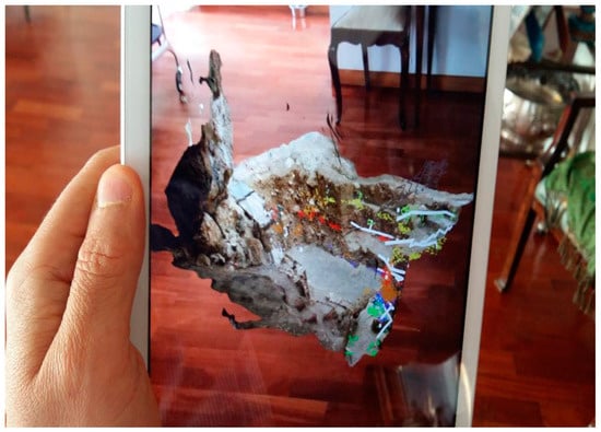 Such anomalies render the position of the 3D cluster unstable and can create a flickering effect that may complicate the interactive examination by the archaeologist in situ.At this point, it is useful to highlight that by employing the manual placement, the in situ positional precision of the 3D cluster depends on both the visual accuracy of the operator and the number of anchors utilised. We estimate, from our mensuration, that it may vary up to several centimetres (±5 cm), even if an exhaustive statistical analysis of uncertainty and error measurements has not been accomplished due to the inaccessibility of the site at the time of this writing. Hence, such examinations remain outstanding and should still be completed.Instead, the employment of a nonelectronic marker-based positioning, namely graphical pattern signs, could bring the profiles into line with higher precision (estimated to ±1 cm). However, in this case, the excavation must provide different permanent markers as anchors on its contour.Finally, it is significant to remark that the desktop environment permits the photogrammetry skeleton and the entire 3D excavation cluster models to fit together with high precision for analytical and positional purposes (same scale and references). - (iii)