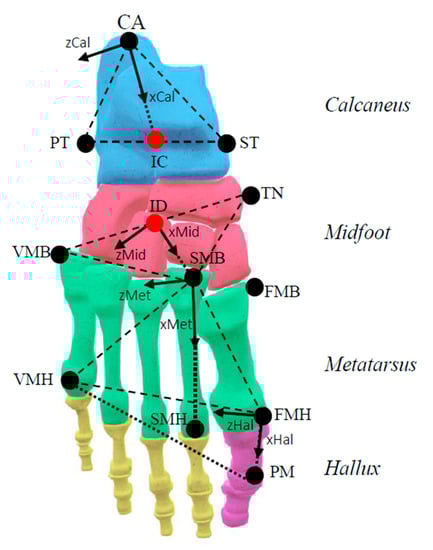 Diagram of the analyzed foot segments with relevant anatomical landmarks and coordinate reference frames (see Leardini et al., 2007). These were assumed to be rigid segments. CA: upper central ridge of the calcaneus posterior surface, ST: medial apex of the sustentaculum tali, PT: lateral apex of the peroneal tubercle, TN: medial apex of the tuberosity of the navicular, VMB: base of the fifth metatarsal, dorsolateral aspect of the fifth metatarso-cuboid joint, FMB: base of the first metatarsal, dorsomedial aspect of the first metatarso-cuneiform joint, VMH: Head of the fifth metatarsal, dorsolateral aspect of the fifth metatarsophalangeal joint, FMH: head of the first metatarsal, dorsolateral aspect of the first metatarsophalangeal joint, SMH: Head of the second metatarsal, dorsomedial aspect of the second metatarsophalangeal joint, SMB: second metatarsal base, assumed to coincide with the most distal and dorsal aspect of the middle cuneiform, PM: Most distal and dorsal point of the head of the proximal phalanx of the hallux, IC: midpoint of the straight line between PT and ST, ID: midpoint of the straight line between TN and VMB.