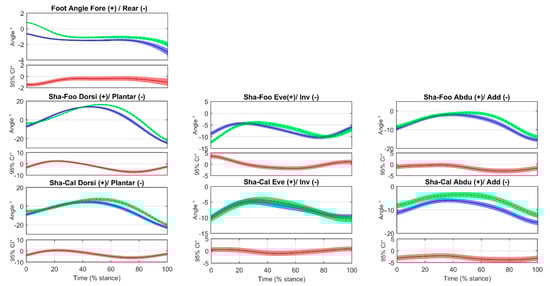Foot angle with respect to the shank (Sha-Foo) and calcaneus with respect to the shank (Sha-Cal) joint angles time normalized across stance phase (0–100%) for forefoot strike (FFS) and rearfoot strike (RFS) patterns. Mean ± standard error (SE) bands are reported (shaded regions). Below of each angle plot, there is a between footstrike pattern difference plot (FFS–RFS) containing the mean ± 95% confidence interval (CI) bands (in red). Regions where those bands diverge from 0 can be considered regions of significant differences. (Legend: FFS in blue, RFS in green).