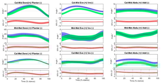Midfoot with respect to the calcaneus (Cal-Mid), metatarsus with respect to the midfoot (Mid-Met), and metatarsus with respect to the calcaneus (Cal-Met) joint angles time normalized across stance phase (0–100%) for forefoot strike (FFS) and rearfoot strike (RFS) patterns. Mean ± standard error (SE) bands are reported (shaded regions). Below of each angle plot, there is a between footstrike pattern difference plot (FFS–RFS) containing the mean ± 95% confidence interval (CI) bands (in red). Regions where those bands diverge from 0 can be considered regions of significant differences. (Legend: FFS in blue, RFS in green).