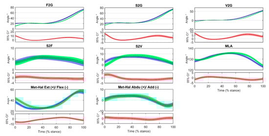 Sagittal-plane inclination of the first metatarsal bone to the ground (F2G), of the second metatarsal bone to the ground (S2G), and of the fifth metatarsal bone to the ground (V2G); transverse-plane divergence between first and second metatarsal bones (S2F) and between fifth and second metatarsal bones (S2V); and first metatarsus and hallux angle (Met-Hal). Time was normalized across stance phase (0–100%) for forefoot strike (FFS) and rearfoot strike (RFS) patterns. Mean ± standard error (SE) bands are reported (shaded regions). Below of each angle plot, there is a between footstrike pattern difference plot (FFS–RFS) containing the mean ± 95% confidence interval (CI) bands (in red). Regions where those bands diverge from zero can be considered regions of significant differences. (Legend: FFS in blue, RFS in green).