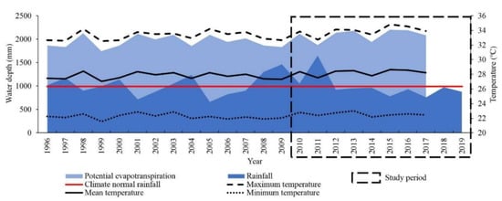 The climate in the region, according to the Köppen classification, is type BSh’ (hot semi-arid), the mean temperature is 28 °C, ranging from a minimum of 22.4 °C to a maximum of 33.5 °C (Figure 2). The mean potential evapotranspiration (PET) is 2000 ± 135 mm yr−1, with the highest rates between August and January. The mean historical rainfall is 994.2 ± 297.3 mm yr−1, with the rains concentrated between December and May, and 43% concentrated between March and April.