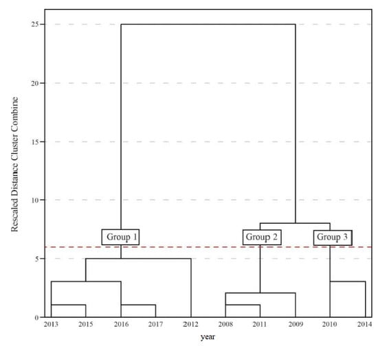 The criterion used to define the cut-off point, and consequently the group number, was the first jump of the rescaled distance []. The first group (G1) was defined by the years 2012, 2013, 2015, 2016 and 2017, which correspond to those with the largest annual water deficit (Table 1). G1 comprised the highest values for temperature and evapotranspiration, in addition to the lowest rainfall, and was characterized as the group with the driest years or with the largest water deficit.