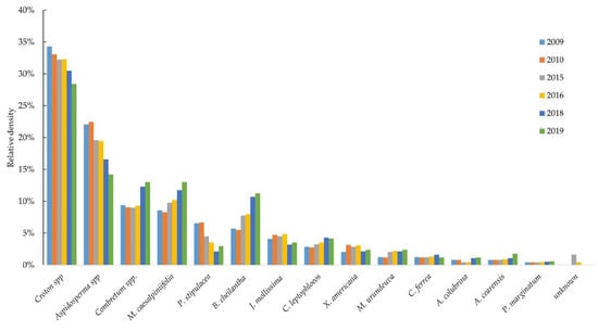 For the diversity of woody cover in the area of DTF/CPD under regeneration for approximately 40 years, nine families, 14 genera and 15 species were identified in total which did not vary over the 11 years (Table 2), characterizing the area as a representative fragment of crystalline caatinga []. The number of families ranged from six to 26, while species from 12 to 64 []. The occurrence of families Anacardiaceae and Burseraceae, represented by the species Myracrodruon urundeuva and Commiphora leptophloeos respectively, show that the area is in an advanced process of regeneration, since these are indicators of more-protected or well-preserved areas of the Caatinga [,].