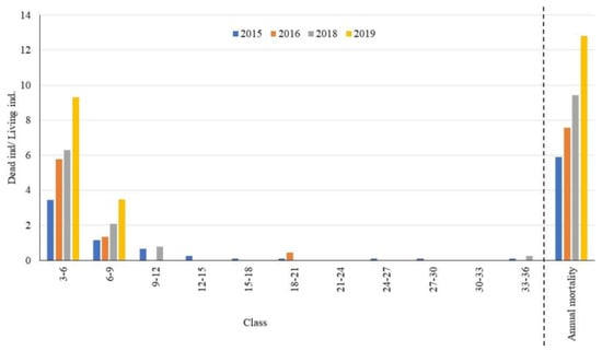 The 3 to 12 cm diameter class concentrated the highest number of dead individuals in relation to the number of living individuals, followed by the 6 to 9 cm class (Figure 5). Annual mortality increased from 6% in 2015 to 12.8% in 2019. The effect of drought on plant mortality tends to accumulate, and there has been an increase in the number of dead individuals over the years. Sixty consecutive dry days (CDDs) were recorded in 2014; during the following years, the number of CDDs doubled: 2015 (120 days), 2016 (150 days) and 2017 (120 days).