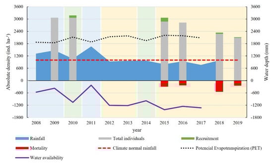 Plant density in 2009 was 3063 ind. ha−1, increasing to 3175 ind. ha−1 in 2010, and decreasing to 3063 ind. ha−1 in 2015, 2825 ind. ha−1 in 2016, 2338 ind. ha−1 in 2018 and 2113 ind. ha−1 in 2019 (Figure 6). This reduction in plant density is the result of a higher mortality rate than recruitment rate, seen during the study period, where there was a mean mortality of 134 ind. ha−1 yr−1 and recruitment of 39 ind. ha−1 yr−1, generating a mean deficit of 95 ind. ha−1 yr−1. Probably, mortality rates that are higher than those of recruitment are strongly influenced by climate seasonality and consecutive years of drought. The reduction in plant density from 2015 to 2019, compared to the period from 2009 to 2010, is related to the droughts which have occurred in the region since 2012 [].