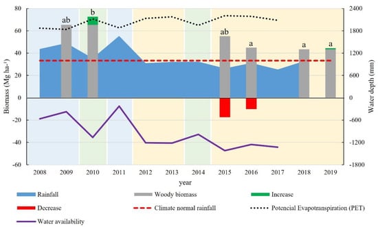 In semi-arid regions, water is the main limiting factor to increases in biomass [], since under conditions of consecutive periods of drought there is an increase in tree and shrub mortality due to the continuous scarcity of water []. Furthermore, the capacity of dry forests to produce biomass year after year is highly variable, precisely because they are influenced by consecutive years of drought, which can reduce this capacity [], demonstrating the impact of climate conditions on biomass production in the DTF [].