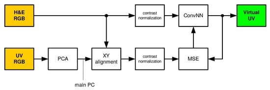 The proposed and tested solution uses a convolutional neural network [23,24,25] that transforms the recorded color images (RGB) into a virtual fluorescence UV image. In the learning and testing phases, the solution presented in Figure 1 is used. During normal operation, the solution presented in Figure 2 is used. Individual blocks are described in the following subsections.
