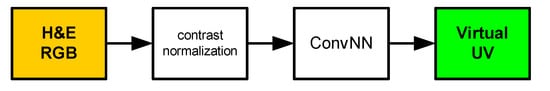 Figure 2. Normal processing phase. H&E RGB: hematoxylin and eosin RGB input image, ConvNN: convolutional neural network, Virtual UV: virtual ultraviolet fluorescence image