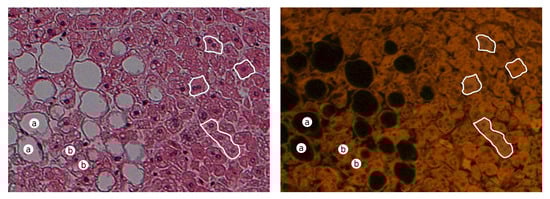Figure 3. Exemplary pair of acquired images for steasosis for H&E (left) and UV fluorescence (right). (Description: a—macrovesicular steatosis; b—microvesicular steatosis; white boundaries—regular hepatocytes).