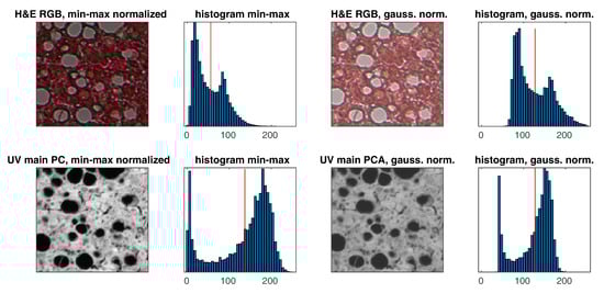 Figure 5. Exemplary pair of images and histograms with min–max and Gaussian (z–score) normalizations (the red vertical line represents the average on histograms).