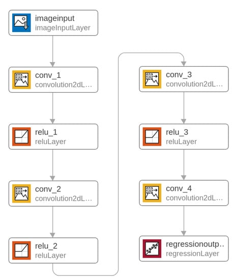 A unidirectional multi–layer convolutional network was proposed for the image conversion task. It is a heteroassociative type network with four convolutional layers. The task of teaching this type of network is to obtain an approximator (using regression) that reconstructs the UV image in grayscale (as the main PCA component) from the RGB color image. The regression criterion is MSE (mean squared error). The input image and the output trainer are normalized. The network diagram is presented in Figure 6, and the exact configuration of the layers is given in Table 1.