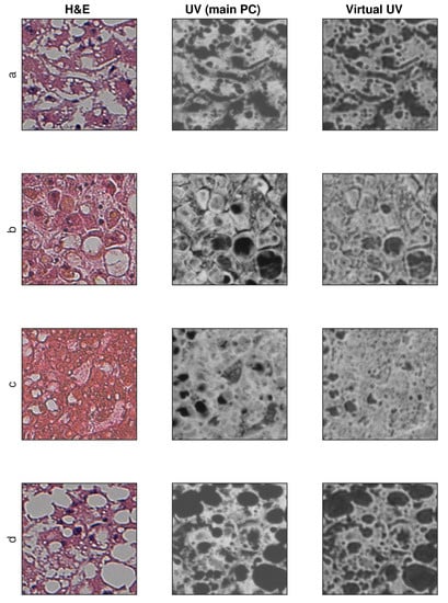 The proposed solution confirms the possibility of converting an H&E color image to a UV virtual image. The random results presented in Figure 8 and Figure 9 show a very high similarity between the real UV image (main PC) and that created by the neural network. It should be noted, however, that not all elements of the structure are mapped, for example in Figure 8c, the dark area in the center of the image.