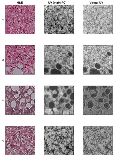 Sample training and testing images are shown in Figure 8 and Figure 9, where H&E is RGB input image, UV (main PC) is a preprocessed UV training image and virtual UV is the output image of the convolutional neural network.