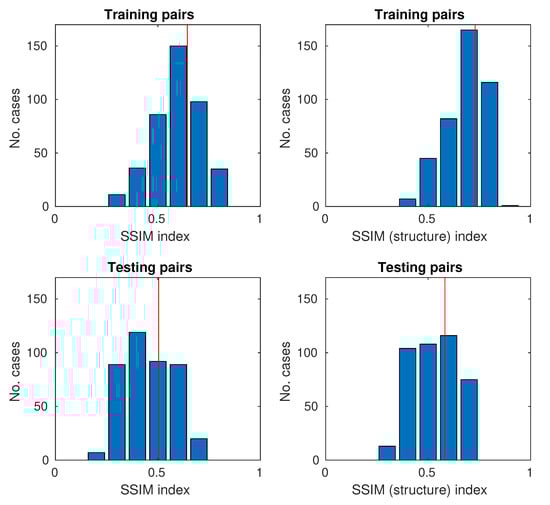 Figure 10. Histograms of SSIM and SSIM (structure only) for training and testing samples (the red vertical line represents the average on histograms).