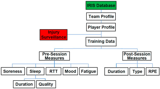 Structure of training monitoring system. IRIS = Irish Rugby Injury Surveillance project. RTT = Readiness to train. RPE = Rate of perceived exertion.