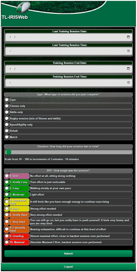 Within 12 h of training or match completion, players recorded the type of session it was, the duration of the session, and the rating of perceived exertion (RPE) measured on a chromatic coloured 0–10 scale [42]. The options for session type included gym, fitness only, skills only, mixed session (fitness and skills), rehab/prehab, and match. Session duration was measured on a scale from 10–180 min in increments of 5 min. RPE is both a very common and valid method of measuring internal training intensity [7,43]. When session duration in minutes is multiplied by the RPE the result is known as the session rate of perceived exertion (sRPE) [44]. This method of calculating TL has been shown to be valid and reliable across a wide variety of exercise modalities [44]. A screenshot of the post-session measures of the TMS can be seen in Figure 3.