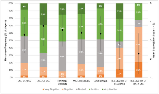 Players were asked to rate seven aspects relating to their experience of using the TMS using a Likert scale from 1–5 (1 = the most negative response, 5 = the most positive response) and the frequency analysis is represented in Figure 4. The methods of feedback given included one-to-one conversations (43%), text message (35%), and collectively at training sessions/meetings (22%). Players were asked how often they or their coach changed their usual training/match preparation based on their data and the mean score was 2.3 ± 1.1, with 1% stating that it always occurred, 21% most of the time, 10% about half of the time, 47% sometimes, and 21% stating that it never occurred.