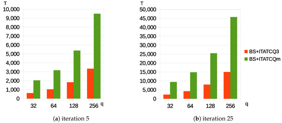 Average execution time (milliseconds) of both variants of BS+ITATCQ at iterations 5 and 25 (q: palette size).