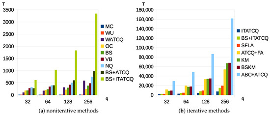 Average execution time (milliseconds) of several color quantization methods. The results of BS+ITATCQ in subfigure (a) correspond to the iteration 5, while the results in subfigure (b) correspond to iteration 25 (q: palette size).