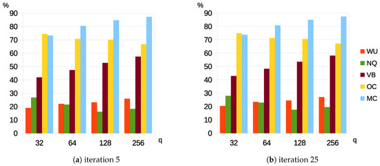 The results included in the tables indicate that BS+ITATCQ3 at iteration 5 obtains better MSE than WU, OC, MC, VB and NQ for all the images and palette sizes. In addition, Figure 5 shows the average percentage of error reduction obtained by BS+ITATCQ3 at iterations 5 and 25 compared to those methods. The summary that shows this figure confirms the superiority of BS+ITATCQ3.