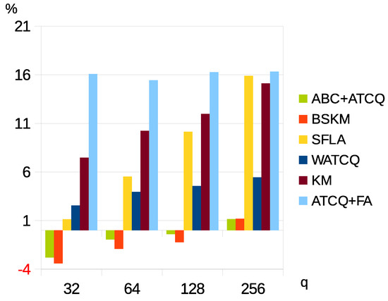 When the results of BS+ITATCQ3 at iteration 25 are compared to those of WATCQ, the first method obtains better results for 89 out of 96 cases. These results are similar in the number of cases to those obtained when KM is compared to BS+ITATCQ, although the range is different. In this case the improvement obtained by BS+ITATCQ compared to WATCQ is at most.