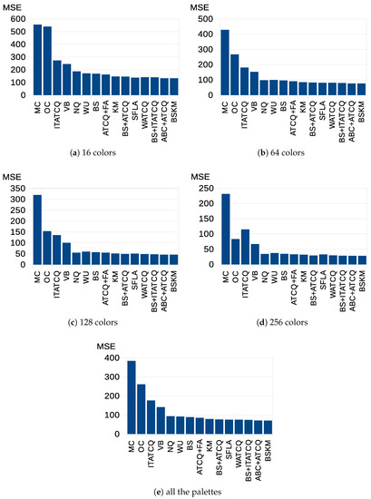 The study proposing the ITATCQ method reported that better results are obtained if the range of values considered for the tests is adjusted according to the size of the quantized palette [40]. Since this was not applied here, a second comparison was performed that considers the minimum MSE obtained by ITATCQ. In this case, the results of BS+ITATCQ3 at iteration 5 are better than those of ITATCQ at iteration 25 in all cases except for 1, corresponding to the Snowman image with 64 colors. In this case the difference is less than . Therefore, ITATCQ errors are worse than those of the new method, even if the comparison considers the minimum error obtained by ITATCQ for each image and palette size.
