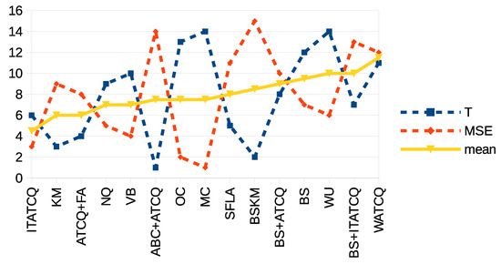 The parameters used for the tests are the following: six food sources have been considered for ABC+ATCQ and six individuals (frogs, fireflies) for SFLA and ATCQ+FA. SFLA was executed considering 2 memeplexes, 4 improvement iterations of each memeplex and a sampling step equal to 10. The ATCQ algorithm combined with other algorithms was executed considering the variant that generates a 3-level tree, since it is faster. In addition, the parameter of ATCQ was set to the same values previously described to execute ITATCQ. Finally, the sampling factor of NQ was set to 1, since this is the value that generates the best results for this method.