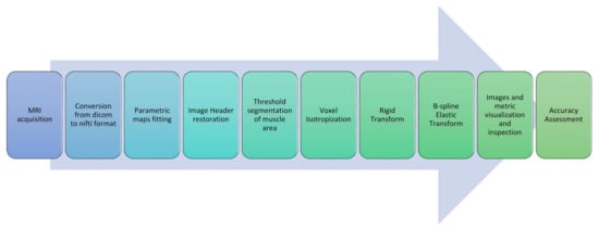 In this section, all the steps constituting the proposed image post-processing and alignment protocol for multimodal MR muscle images are described. A concise graphical representation is displayed in Figure 1.