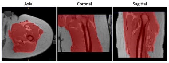 Muscle ROIs delineation on T1-w MR images in 3 orthogonal views.