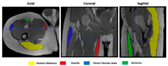 To give a quantitative assessment of the transformation accuracies, the surfaces of 4 representative hip muscles—gracilis, sartorius, gluteus maximus, and tensor fasciae latae—were manually delineated, slice by slice, on the T1w images (Figure 4) at both t0 and t1 separately with ITK-Snap [34]. Region of Interests (ROIs) volumes are listed in Table 1. Contours on t1 were then automatically deformed on the corresponding t0 volumes using the resulting transformation of each registration. Nearest-neighbor interpolation was applied to keep the integer values of the original labels.
