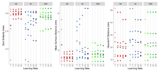 For each condition, we run the registration with five different learning rates: 1 (the default value in simple ITK), 3, 5, 10, and 15.